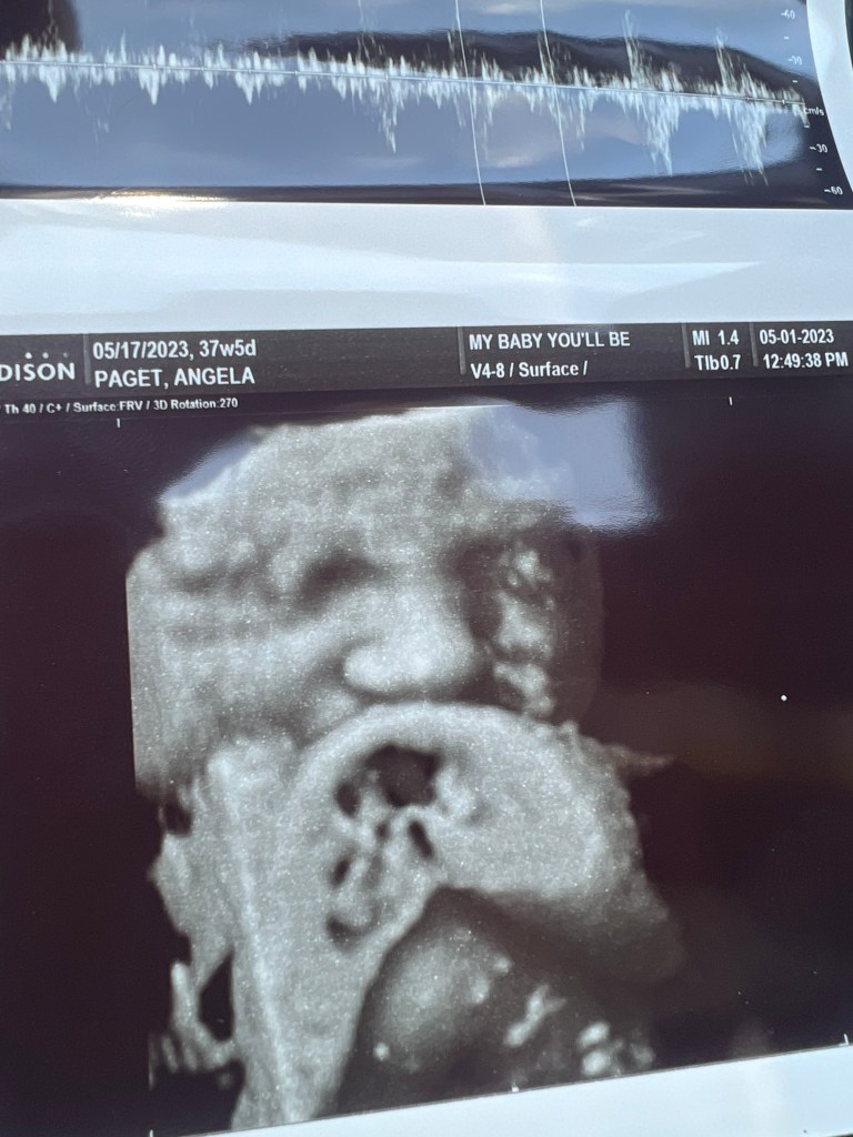 At my 38 week appointment Last week I did an ultrasound with My Baby You’ll Be and it brought such peace of mind. I don’t have any ultrasounds after 26 weeks because my OB typically doesn’t offer more than 2 (26 weeks/6 weeks). I do like that they are non-invasive with pregnancies but I also get a little curious as to how baby is doing and looking and all the things. I was already 37 weeks along so the recommended time frame for a 4D picture had expired out. However, they were able to get a little snap of his face showing just above his nose. He looks so cute and I am so excited to meet him even more. From the looks of it, he looks to have a Jackson nose just like Benny. Hmmm… so curious as to what other features he will have. Bennett was a total surprise because I expected a ginger with blue eyes and light skin. He is all the opposite of those things! He came out olive, full head of dark hair and beautiful dark eyes. We were able to see that Declan has hair too! Again, so curious as to the coloring of his skin, his eyes and his hair.